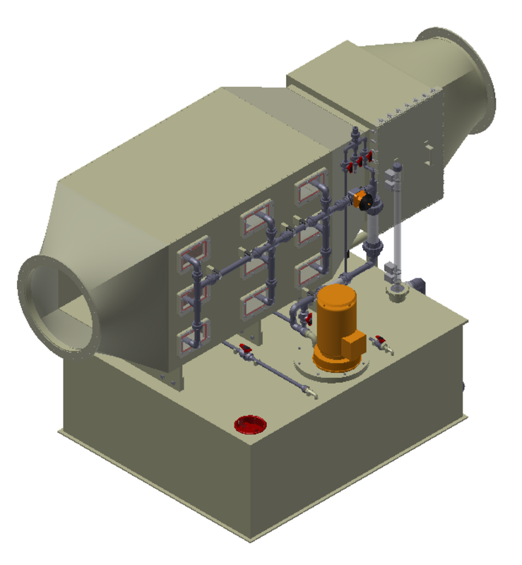 - Horizontal durchströmtes Gehäuse mit Sprühzone